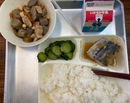 今日の給食の献立は、さごしのおろし醤油かけ、大豆と冬野菜の煮物、きゅうりの生姜漬け、ご飯、牛乳でした。さごしは脂が乗っていて、さっぱりとしたおろし醤油とよく合いました。大豆は、タンパク質を多く含んでいるので「畑の肉」と呼ばれています。また、ビタミン、カルシウム、鉄なども含んだ栄養価の高上がり食品です。きゅうりの生姜漬けは、きゅうりそのもののおいしさが味わえる献立でした。