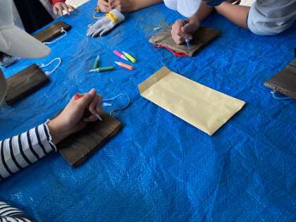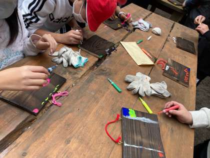できた焼き板にペイントで考えてきた図柄を描き込んでいます。なかなかの力作ができています。
