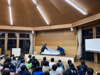 おやつの後、布団にシーツをかけて寝るための説明を聞いています。これからお風呂と寝る用意をします。