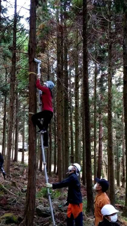 これも林業体験です。はしごを登って枝打ちするのはとても大変なお仕事ですね。