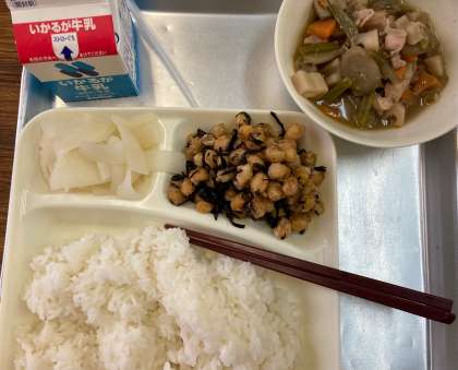 今日の給食の献立は、筑前煮、ひじき豆、大根の柚子風味、ご飯、牛乳でした。筑前煮は、福岡県で昔から食べられてきた伝統的な料理です。福岡県では「がめ煮」と呼び正月や祭り、祝い事の時によく食べられます。れんこんやごぼう、しいたけなどたくさんの野菜が入っていました。ひじき豆は、豆もひじきもおいしかったです。大根の柚子風味は、さっぱりしていて、全体にバランスの良い献立でした。