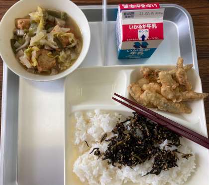 今日の給食の献立は、いわし天ぷら、厚揚げと野菜の煮物、ごまひじき、ご飯、牛乳でした。外がカラッと揚げられたいわしは食べやすかったです。厚揚げはふわりと、鶏肉や野菜はしっとりと煮含められていました。ごまひじきには、大根葉も入っていて、ごはんによく合いました。