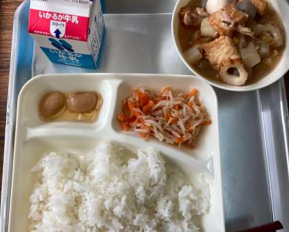 今日の給食の献立は、関東煮(うずらたまご)、甘酢和え、白花豆の煮物、ご飯、牛乳でした。関東煮には大根などの野菜が柔らかく煮込まれていました。甘酢和えは、にんじんともやしががさっぱりとした味付けで和えられていました。白花豆は、インゲン豆の仲間で、ほとんどが北海道で作られています。柔らかくて甘い味付けでした。