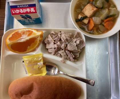 今日の給食の献立は、豚肉のオイスターソース焼き、厚揚げと大根の中華煮、デコポン、パン、牛乳、アプリコットジャムでした。豚肉は焼き物機で香ばしく焼かれていました。厚揚げはボリュームがあり、柔らかい大根とよくあっていて、食べごたえがありました。デコポンは今が旬の果物でおいしかったです。