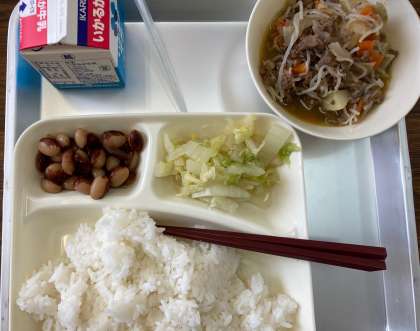 今日の給食の献立は、肉じゃが、白菜の柚子風味、とら豆の煮物ご飯、牛乳でした。肉じゃがはたくさんの肉と柔らかく煮込まれたじゃがいもがご飯にぴったりの主菜でした。白菜は、柚子の爽やかな香りと程よい酸っぱさがありました。とら豆は、インゲン豆の仲間で、半分は白く半分は薄茶色の模様が、虎に似ていることから「とら豆」という名前がつきました。炭水化物やたんぱく質、カルシウムのほかに、お腹を掃除する食物繊維がたくさん含まれています。こってりとした肉じゃがと爽やかな白菜の柚子風味、ほんのり甘いとら豆の煮物は、味のバランスがとてもよい献立でした。