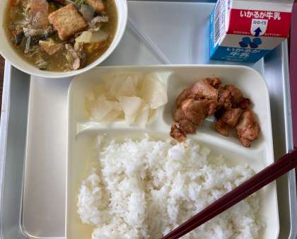今日の給食の献立は、鶏肉のチリソース焼き、中華煮、大根の中華和え、ご飯、牛乳でした。鶏肉は香りが高い豆板醤やケチャップなどで味付けされていて、中は柔らかく仕上げられていました。中華煮には厚揚げが入っていて、食べ応えがありました。大根は胡麻油の香ばしい香りがして優しい味わいでした。