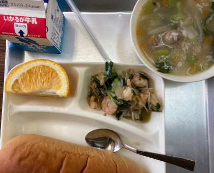 今日の給食の献立は、えびと野菜の炒め物、中華粥、はっさく、パン、牛乳でした。えびと野菜の炒め物は、ニラやもやしなどがたっぷり入っていました。中華粥にも野菜と肉団子が入っていて、体が温まりました。はっさくは、12月ごろから収穫が始まります。採れたばかりのはっさくは、酸味が強いので、1.2か月ほど置きます。酸味が弱くなって食べごろになる2月から3月にたくさん出回ります。