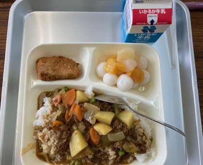 今日の給食の献立は、入学・進級のお祝い献立で、カツカレーライス、フルーツ白玉でした。カツは柔らかくて食べやすく、香りの高いカレーとよく合いました。フルーツ白玉は、優しい甘さで、デザートとして最適でした。