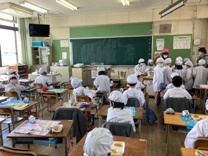 新学期に入って初めての給食です。2年生が静かに配膳していました。おしゃべりもしないで食べなくてはいけませんが、子どもたちの表情は明るかったです。