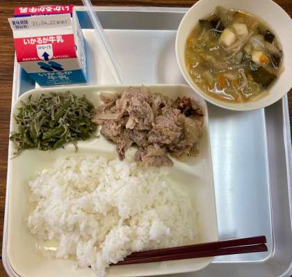 今日の給食の献立は、豚肉の生姜焼き、味噌汁、じゃこピーマン、ご飯、牛乳でした。豚肉の生姜焼きは、生姜のさわやかな香りと、豚肉の旨味、玉ねぎの甘さがバランスよく合わさっていました。味噌汁は具沢山で、野菜からたくさんの栄養が溶け込んでいる味わいでした。じゃこピーマンは、意外な組み合わせですが、ピーマンの苦手な子どもも無理なく食べられるおいしさでした。