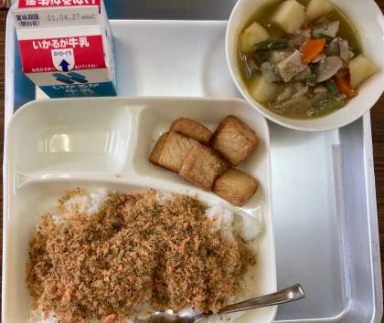 今日の給食の献立は、鶏肉とじゃがいもの煮物、厚揚げの醤油だれかけ、紅鮭そぼろ、ご飯、牛乳でした。鶏肉とじゃがいもの煮物は、ホクホクしたじゃがいもとその他の野菜と鶏肉が優しい味付けで煮込まれていました。厚揚げは外がこんがり、中はジューシーで醤油が沁みておいしかったです。紅鮭そぼろはご飯が進みました。