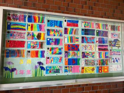 5月の玄関掲示は、1年生が作った鯉のぼりです。明るくてカラフルな色がみんなの心も明るくしてくれます。