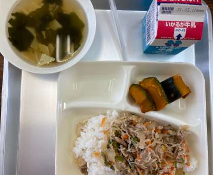 今日の給食の献立は、豚丼、湯葉のすまし汁、かぼちゃの醤油焼き、牛乳でした。豚丼は、お肉と野菜の旨味が口の中に広がりました。味は濃すぎず、たくさん食べられるました。湯葉は豆乳を煮て、表面にできた薄い膜を引き上げて作ります。たんぱく質、脂質、カルシウムなどを多く含んでいます。あっさりとしたすまし汁は、上品な味わいがありました。かぼちゃの醤油焼きもご飯によく合いました。