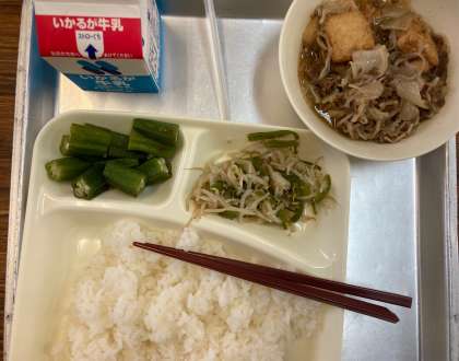 今日の給食の献立は、すき焼き煮、オクラのかつお梅風味、もやしとピーマンのごま炒め、ご飯、牛乳でした。すき焼き煮は、お肉の旨味と野菜の美味しさが味わえました。オクラはさっぱりと梅風味、もやしとピーマンはごまお香りがして、どれもご飯によく合いました。