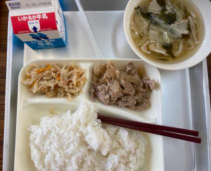 今日の給食の献立は、豚肉の甘辛焼き、すまし汁、切り干し大根の炒め煮、ご飯、牛乳でした。豚肉の甘辛焼きは、豚肉の旨味と玉ねぎの甘さが感じられ、ご飯に最適なおかずでした。すまし汁にはかまぼこも入っていて、その味わいと出汁がきいていました。切り干し大根は、大根を細く切ったものを干して作ります。干すことで旨味が増し、栄養価も増えます。生の大根と比べると食物繊維やカルシウム、鉄がとても多くなるそうです。栄養バランスの良い献立でした。