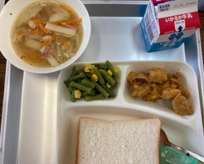 今日の給食の献立は、鶏肉のカレーマヨネーズ焼き、てぼ豆のスープ、三度豆とコーンのサラダ、パン、牛乳でした。鶏肉のカレーマヨネーズ焼きはタンドリーチキン風の本格的な味付けとスパイスの香りを味わえました。てぼ豆のスープは豆がアクセントになっていました。三度豆は、一年に3度とれることから「三度豆」と言われるようになりました。インゲン豆が大きくなる前に、さやごと食べる野菜です。コーンと一緒にさわやかなサラダになりました。