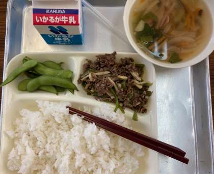 今日の給食の献立は、チンジャオニューロースー、ハムと野菜の中華スープ、枝豆、ご飯、牛乳でした。チンジャオニューロースーは、ピーマンと牛肉を細く切って炒めた中国の料理です。中国語で「チンジャオ」はピーマン、「ニューロー」は牛肉、「スー」は細切りという意味です。ピーマンが苦手な子どもでもパクパク食べられそうでした。中華スープには、透き通るまで煮込まれた玉ねぎや椎茸が入っていて、ハムからもいいお出しが出ているような旨味がありました。枝豆は、豆本来の美味しさが味わえました。