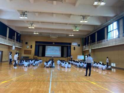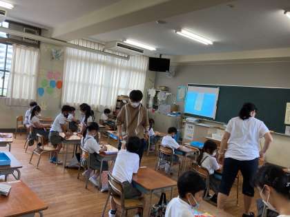 今日は土曜授業です。1時間目は避難訓練、2時間目は防災学習を行っています。4・5・6年生は、講堂で区役所の方から映像などを見て防災について学びました。1・2・3年生は、新聞紙でスリッパを作る方法を学んでいます。