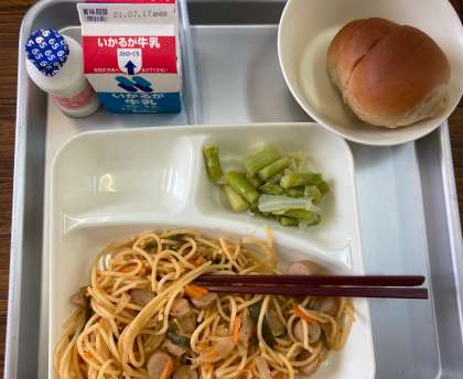 今日の給食の献立は、チキントマトスパゲッティ、グリーンアスパラガスとキャベツのサラダ、発酵乳、パン、牛乳でした。チキントマトスパゲッティは、たくさんの野菜の旨味が感じられ、たくさん食べられる味付けでした。グリーンアスパラガスとキャベツは、蒸し焼きにされ、ワインビネガーの野菜酸味がさわやかな一品でした。発酵乳は、牛乳を乳酸菌で発酵させて作ります。発酵乳に多く含まれるカルシウムには、骨や歯を丈夫にする働きがあります。