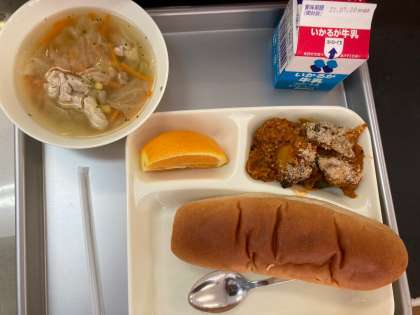 今日の給食の献立は、かぼちゃのミートグラタン、スープ、オレンジパン、牛乳でした。かぼちゃには西洋かぼちゃ、日本かぼちゃ、ペポかぼちゃの3種類に分けられます。給食では、西洋かぼちゃをカレー、シチュー、味噌汁などに使われています。挽き肉が入っていてボリュームたっぷりのグラタンでした。スープにはたくさんの野菜が入っていました。オレンジはさわやかな甘味がありました。
