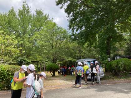 避難訓練の後,活動班でグリーンウォークに出発しました。施設の中にあるいろいろな木の名前を書いていくゲームです。意外と難しいようです。