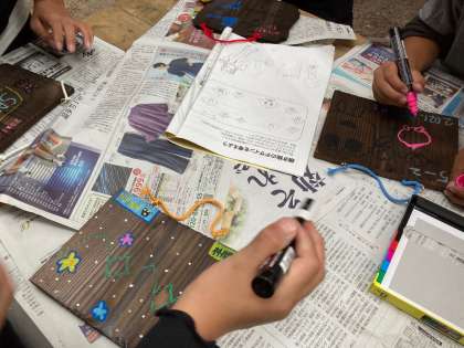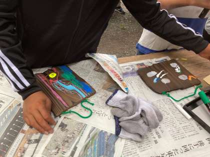 焼いた板をがんばって磨いた後、ペインティングをしています。自分で考えてきたデザインに仕上げて、満足げな子どもたちです。