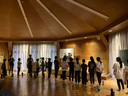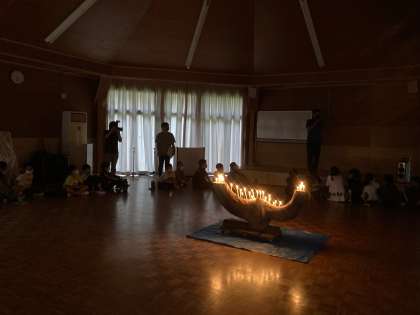 体育棟でキャンドルファイヤーが始まりました。係の人たちがゲームの紹介をしてから、みんなで楽しんでいます。