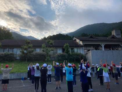 7時からラジオ体操をしました。朝日がさしてきて、気持ちのよい空気をいっぱい吸って,少し眠そうな表情ですが、元気に体操しています。