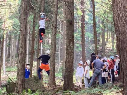 いよいよ実際に体験活動が始まりました。学級の代表が梯子に登って枝打ち体験です。この作業は,まっすぐな木材を作るために必要な作業です。子どもたちは,ヘルメットをかぶって梯子に登り,ノコギリで枝を切り落としています。