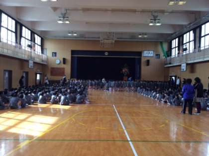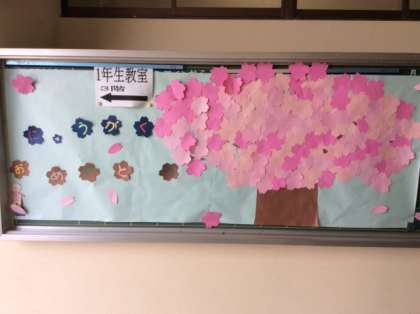 4月9日(木)の一時間目に、1年生との対面式を行いました。6年生の代表の人が歓迎のあいさつをし、2年生からメダルをプレゼントしました。1年生は全員で「よろしくお願いします」ということができました。写真は2年生がプレゼントを渡すところと、給食室前の掲示です。給食調理員さんの手作りです。