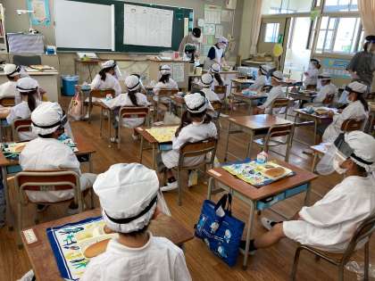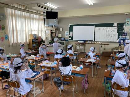 1年生の子どもたちが2学期最初の給食の準備をしていました。マスクの上からフェースシールドをして,1人ずつおかずやパンなどを配膳しています。みんな静かに待っていて、感心しました。フェースシールドは,使った後毎日消毒しています。