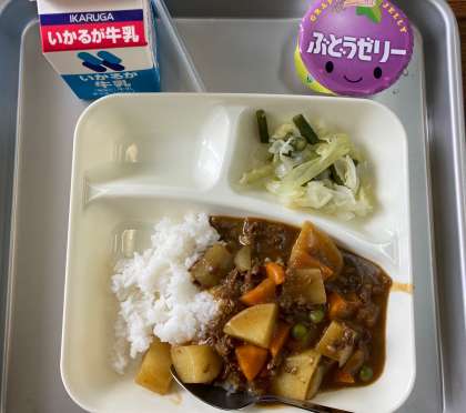 今日の給食の献立は、ビーフカレーライス【米粉】、野菜のピクルス、ぶどうゼリー、牛乳でした。カレールウのもとは、カレーに味をつけたり、とろみをつけたりするものです。給食で使うカレールウのもとには、いつもは小麦粉がつかわれていますが、小麦アレルギーの人も食べられるように、小麦粉の代わりに米粉が使われています。カレーのスパイシーな香りと牛肉の旨味が感じられました。野菜のピクルスは、甘酸っぱくてカレーによく合いました。ぶどうゼリーもさわやかな甘さが、口の中をさっぱりとさせてくれました。