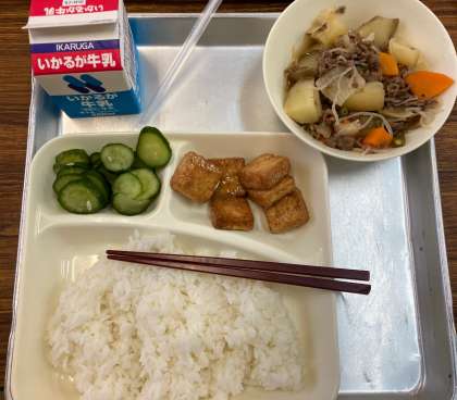 今日の給食の献立は、肉じゃが、厚揚げの味噌だれかけ、あっさりきゅうり、ご飯、牛乳でした。肉じゃがはたっぷりのお肉とじゃがいも、玉ねぎなどの旨味がたっぷり感じられました。厚揚げは焼き物機で外側が香ばしく焼かれていて、濃いめの味噌だれがよく絡んでいました。あっさりきゅうりは、濃い味のおかずとのバランスがよかったです。