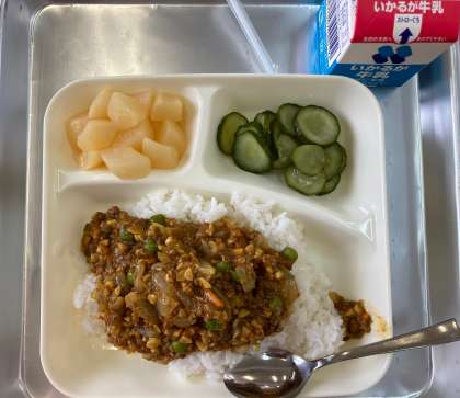 今日の給食の献立は、大豆入りキーマカレーライス、きゅうりのピクルス、白桃(カット缶)、牛乳でした。キーマとは、インドの言葉で細かいものを意味し、ひき肉を使ったカレーをキーマカレーといいます。ひき肉の他に、ひきわり大豆も入っています。小麦粉の代わりに、米粉を使ったカレールウの素で味付けしているので、小麦アレルギーの人も食べることができます。カレーの香りが食欲をそそります。きゅうりのピクルスは、酸っぱ過ぎずさわやかな味付けでカレーの付け合わせにぴったりでした。白桃も柔らかくて、デザートに最適でした。