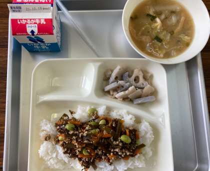 今日の給食の献立は、もずくと豚ひき肉のジューシー、さつまいもの味噌汁、焼きレンコン、ご飯、牛乳でした。ジューシーとは、豚肉やひじきなどを使った「沖縄風炊き込みご飯」のことです。沖縄の伝統的な料理は、琉球料理と呼ばれています。豚肉や豆腐、昆布などの海藻、野菜を使った料理が多く、栄養バランスに優れています。切りコンプやもずく、枝豆などが入っていて、ご飯に混ぜると食欲をそそりました。味噌汁には、さつまいもの他、薄揚げや鶏肉などの旨味が溶け込んでいて深い味わいでした。焼きレンコンも歯応えを楽しめました。