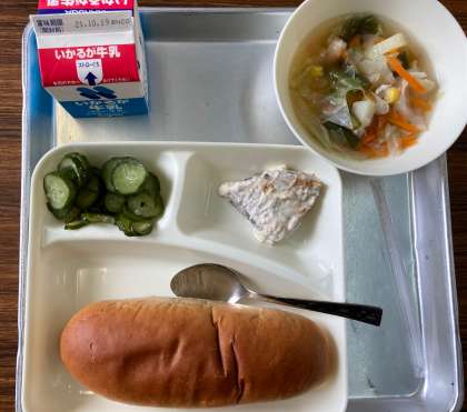 今日の給食の献立は、かつおのマリネ焼き[ノンエッグドレッシング]、鶏肉とじゃがいものスープ、きゅうりのサラダ、パン、牛乳でした。かつおのマリネ焼は、少し酸味のあるドレッシングとかつおの旨味が味わえました。鶏肉とじゃがいものスープは、あっさりとしたスープに鶏肉や野菜からも出汁がでて、味わい深かったです。きゅうりのサラダも歯応えが楽しめました。