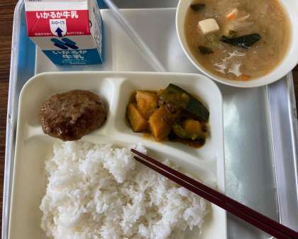 今日の給食運の献立は、和風ハンバーグ、豆腐の味噌汁、かぼちゃのいとこ煮、ご飯、牛乳でした。和風ハンバーグは、醤油ベースであっさりとしていてコクもありました。豆腐の味噌汁は、野菜がたくさん入っていて栄養たっぷりです。いとこ煮はかぼちゃと小豆が甘く煮付けられていました。