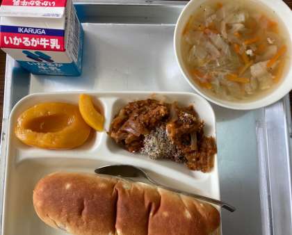 鶏肉と野菜のスープ、黄桃(缶)、パン、牛乳でした。なすのミートグラタンは、ひき肉の旨味と玉ねぎなどの甘味が感じられました。鶏肉と野菜のスープは、あっさりしていてこくがあり、グラタンとの相性がぴったりでした。黄桃は、実がかたいのが特徴で缶詰にされることが多いそうです。山形県産の黄桃を使い、2つに割ってシロップにつけて作られています。優しい甘さはデザートにぴったりでした。