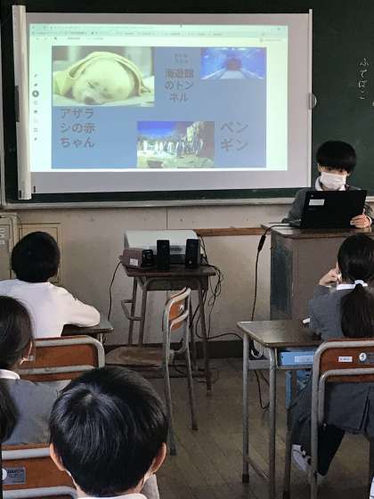 今日は、4年生が明日の遠足について、3年生にパワーポイントを使って、プレゼンテーションをしてくれました。