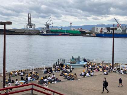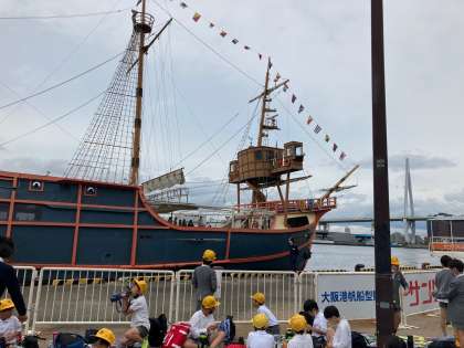 お昼のお弁当を食べておやつもいただいています。サンタマリア号がすぐそばに入港してきました。