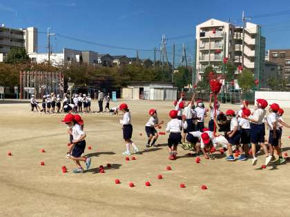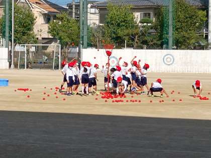 1年生は体育の時間に運動会でできなかった玉入れをしていました。子どもたちは張り切って玉を投げていました。