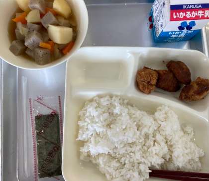 今日の給食の献立は、味噌カツ、じゃがいもと野菜の煮物、焼き海苔、ご飯、牛乳でした。味噌カツはからりと揚げられた小さめのカツに甘辛い味噌がかかっていて、味わい深くご飯によく合いました。じゃがいもと野菜の煮物に入っているこんにゃくには、食物繊維がたくさん含まれています。食物繊維には、便秘を予防し、お腹の調子を整えたり、食べ過ぎを抑え、肥満を予防する働きがあります。たくさんの野菜も入っていて栄養満点です。