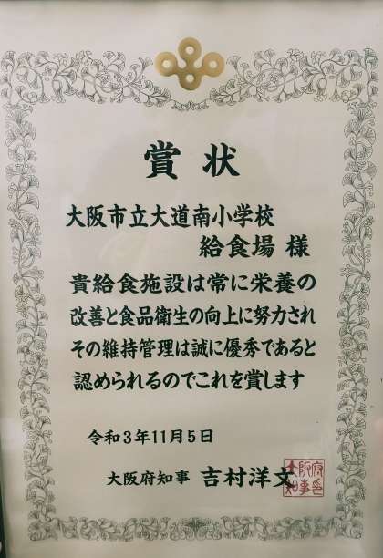 この度、本校の給食場が表彰されました!