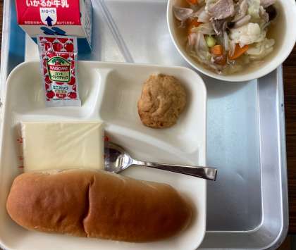今日の給食の献立は、豆腐ハンバーグ、カリフラワーのスープ煮、スライスチーズ、パン、牛乳でした。豆腐ハンバーグは、ケチャップをかけて食べます。優しい味わいでした。カリフラワーには「キャベツの花」という意味があります。キャベツと同じ種類の野菜で11月〜3月頃にたくさんとれて、おいしくなります。カリフラワーにたくさん含まれているビタミンCには、傷が治りやすくする働きがあります。スープ煮には他に枝豆などが入っていてアクセントになっていました。