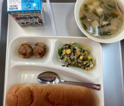 今日の給食の献立は、揚げシューマイ、豆腐のスープ、ツナとチンゲンサイの炒め物、パン、牛乳でした。揚げシューマイは、カラッと揚げられていて、中はジューシーでした。豆腐のスープは、野菜がたっぷりで優しい味付けでした。ツナとチンゲンサイの炒め物はしっとりしていてチンゲンサイの旨味が味わえました。