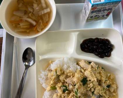 今日の給食の献立は、親子丼、すまし汁、黒豆の煮物牛乳でした。親子丼は、ふわふわの卵と柔らかい鶏肉青ネギでご飯が進みました。すまし汁は出汁がきいていて、優しい味わいに体が温まりました。黒豆は、お正月に食べるおせち料理の一つです。黒豆には「まめに(まじめに)働き、まめに(健康に)暮らせますように」という願いが込められています。甘くてちょうどいい柔らかさに煮込まれていました。