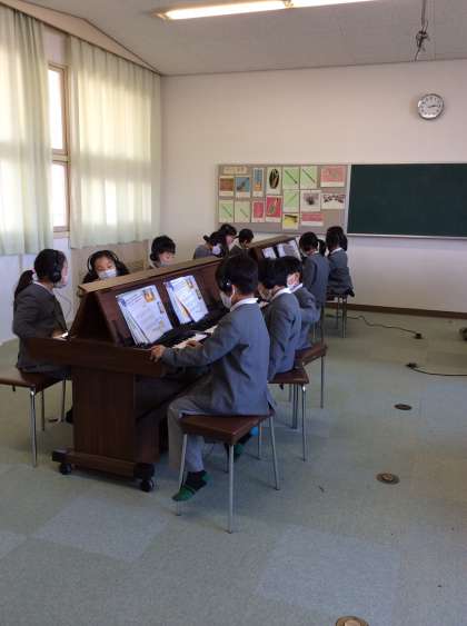 音楽室に行き、オルガンの練習をしています。ヘッドホンをつけ、自分の音を聴きながら繰り返し練習しています。指づかいも上手になってきました。