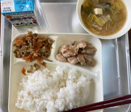 今日の給食の献立は、鶏肉のしょうゆマヨネーズ焼き、味噌汁、きんぴらごぼう、ご飯、牛乳でした。鶏肉は、料理酒、濃口醤油、マヨネーズで下味をつけて、焼き物機で香ばしく焼かれています。味噌汁には、豆腐やわかめ、大根や白菜が入っていて、具沢山でした。きんぴらごぼうは、ごぼうを油で炒め、砂糖、醤油などで味付けしたものです。今日は豚肉、ごぼう、にんじんを炒めています。ご飯によく合う味付けでした。