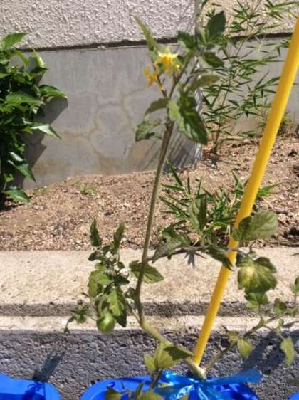 1年生と2年生は生活科で、「アサガオ」と「ミニトマト」を一人一鉢育てています。玄関に並べられた鉢に毎日水をあげて大事に世話をしています。1年生のアサガオには、本葉が出てきました。2年生のトマトには、小さな実ができてきています。みんな楽しみに観察しています。