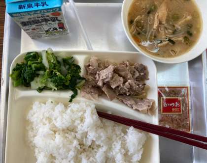 今日の給食の献立は、豚肉のしょうが焼き、さつまいもの味噌汁、菜の花のおひたし、ご飯、牛乳でした。豚肉は、しょうがの香りがして旨味がたっぷりでした。味噌汁は出汁が丁寧にとられていて、さつまいもの甘さがアクセントになっていて、深みのある味わいでした。菜の花は、色鮮やかな緑色をしたほろ苦い野菜で「菜花」や「花菜」ともいわれています。春が旬の野菜で2月から3月ごろ多く出回ります。鰹節をかけて春を味わいました。